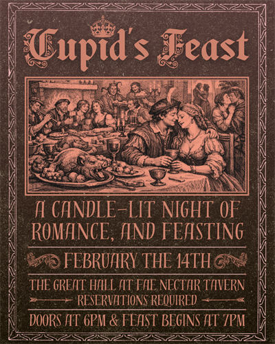 Welcome to CUPID’S FEAST, a romantic, candlelit evening of fine feasting, live music, and immersive theatrical mischief. Cupid may have found his way to Fae Nectar… but rumor has it he arrived a touch unsteady on his wings. With the guidance of Lady Devotion and Lady Mischief, our guests will help divine his true mission…and perhaps set a few hearts fluttering along the way.