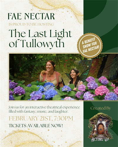 Perfect for adventurers of all ages, The Last Light of Tullowyth is a fun, family-friendly experience full of humor, heart, and fantasy flair. This special performance is also a benefit show for Fae Nectar, with proceeds supporting the future of our magical community and tavern. Gather your party, bring your sense of humor, and join us for an evening of theatrical fun in the realm of Tullowyth!